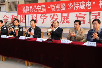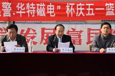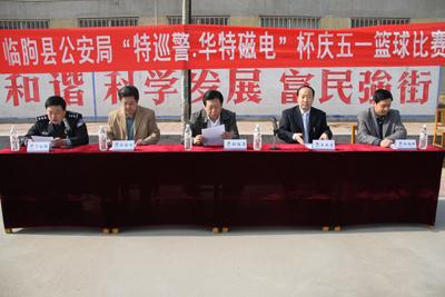 4月29日上午,由公司協辦的臨朐縣公安局“特巡警·華特磁電”杯慶五一籃球比賽在東城區吳家廟籃球場舉行??h公安局政委張伯濤、縣公安局副局長楊維護,我公司董事長兼總經理王兆連出席開幕式。王兆連董事長在開幕式上講話,代表公司向大賽表示祝賀并?;@球賽圓滿成功。