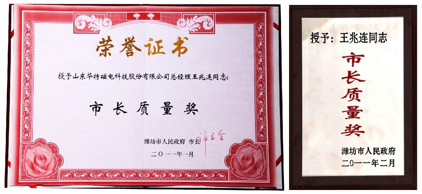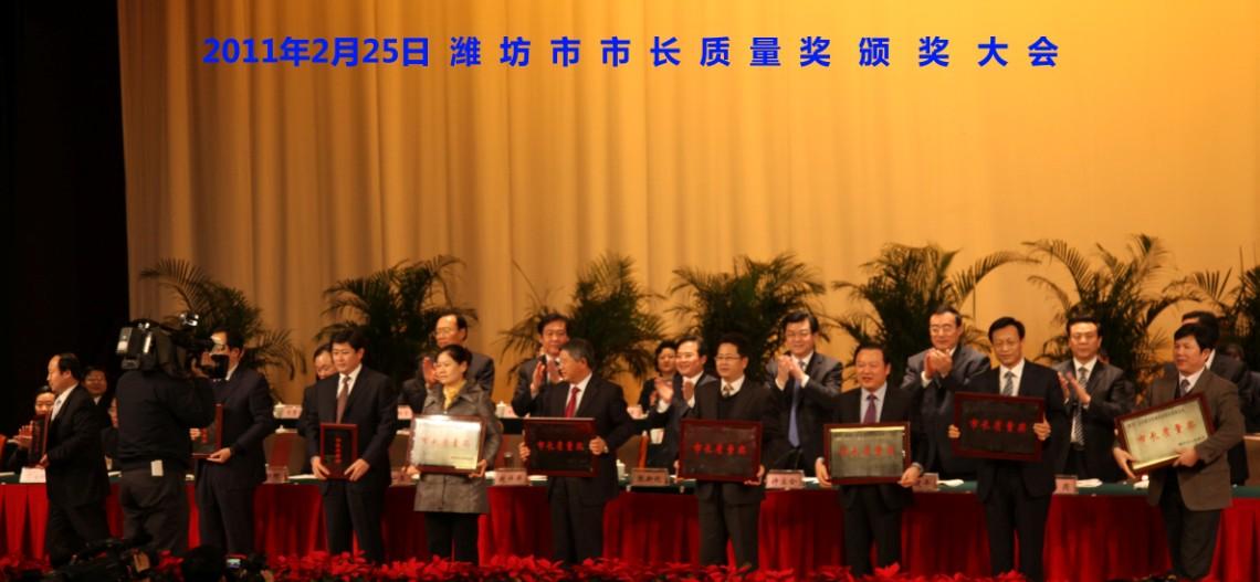 2月25日,在濰坊召開(kāi)的市長(zhǎng)質(zhì)量度獎(jiǎng)?lì)C獎(jiǎng)大會(huì)上,公司董事長(zhǎng)兼總經(jīng)理榮獲“2010年度濰坊市市長(zhǎng)質(zhì)量獎(jiǎng)”。這是濰坊市最高質(zhì)量獎(jiǎng)項(xiàng)。王兆連董事長(zhǎng)帶領(lǐng)企業(yè)積極推行卓越績(jī)效評(píng)價(jià)準(zhǔn)則等先進(jìn)質(zhì)量管理方法,倡導(dǎo)創(chuàng)建有特色的企業(yè)質(zhì)量文化,強(qiáng)化技術(shù)創(chuàng)新體系建設(shè),推動(dòng)降低消耗、利用資源、保護(hù)環(huán)境,實(shí)現(xiàn)了質(zhì)量效益和可持續(xù)發(fā)展。