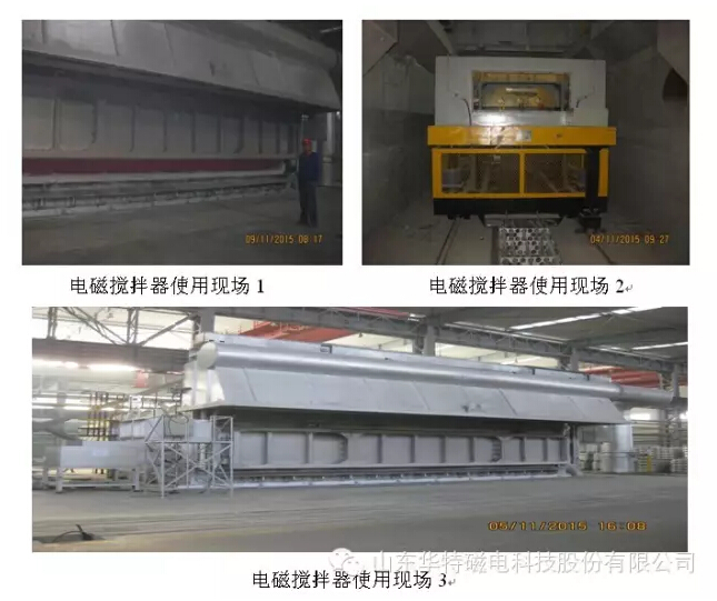 由山東華特磁電科技股份有限公司生產的交直交電磁攪拌器于2015年11月6號在(西部水電)青海慶豐鋁業公司投入使用,經用戶使用證明:各項性能指標檢驗均符合相關標準;通過攪拌15分鐘后(一個周期),爐內溫度上下偏差小于5度;且合金成分相對偏差小于百分之五,用戶使用非常滿意。 本臺電磁攪拌器是目前國內生產的最大噸位的電磁攪拌器,該電磁攪拌器與國外生產的電磁攪拌器相比,具有對電源環境適應能力強,運行穩定,噸鋁電耗少,維護簡便等特點。