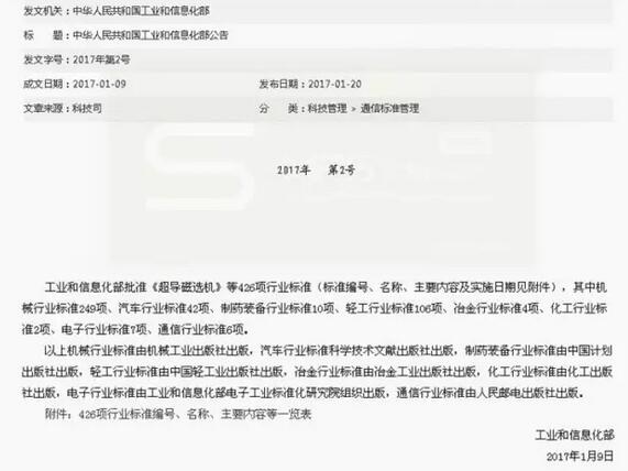 2017年7月1日,由華特磁電主持制定的《JB/T 13013-2017強制油冷卻立環(huán)高梯度磁選機》、《JB/T 13008-2017礦物氣流分級機》、參與制定的《JB/T 13002-2017超導(dǎo)磁選機》等3項行業(yè)標準由國家工業(yè)和信息化部正式頒布實施。截至目前,華特磁電已累計主持制定和參與制定行業(yè)標準達16項。