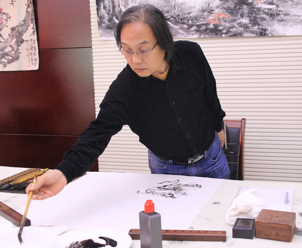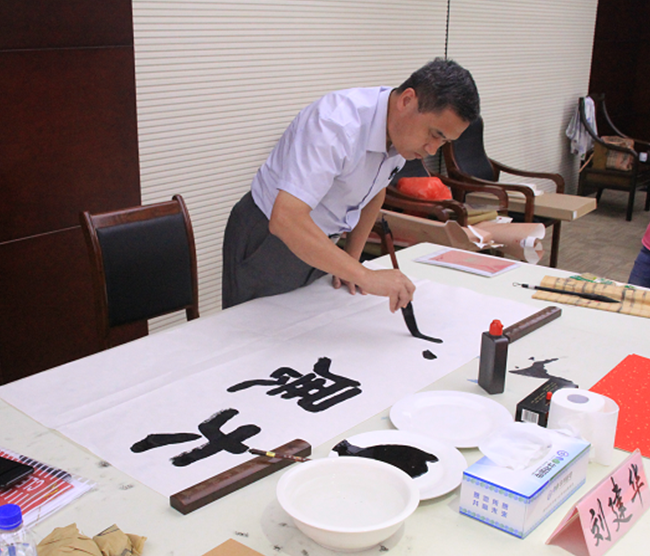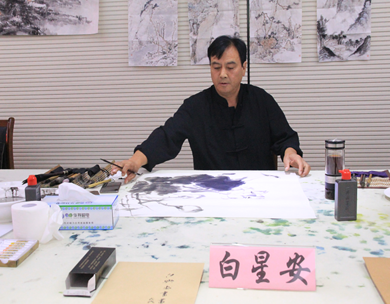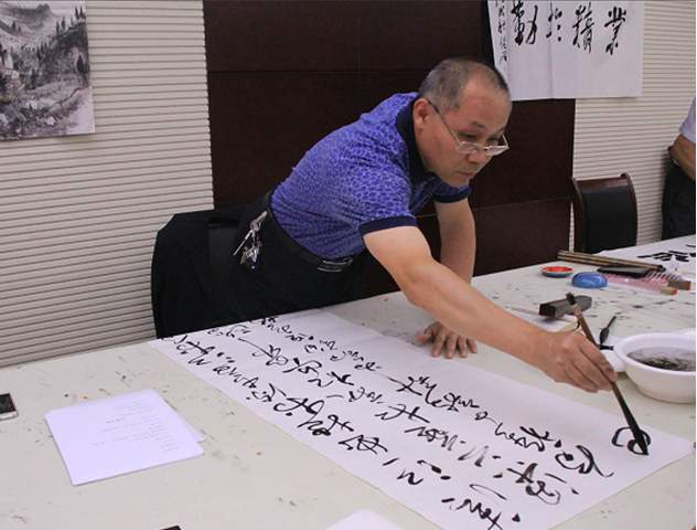 短暫的座談會(huì)后,畫家們來到了公司二樓多功能大廳開始了書畫創(chuàng)作。臨朐美術(shù)名家參加活動(dòng)的有:傅立、白星安、王法生、姜會(huì)信、王春國(guó);臨朐書法名家參加活動(dòng)的有:張頤人、宋智利、劉建華、周世民、楊文梁。老師們書畫創(chuàng)作的熱情高漲,一直創(chuàng)作到下午1:00才收筆。