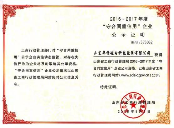 根據(jù)《山東省守合同重信用企業(yè)公示辦法》,山東省工商局決定,向社會(huì)公示2016~2017年度“守合同重信用”企業(yè)共5487戶,山東華特磁電科技股份有限公司榜上有名。本次被認(rèn)定為“山東省守合同重信用企業(yè)”是對(duì)公司近兩年在合同信用管理、合同履約、經(jīng)濟(jì)效益、社會(huì)責(zé)任和信用信譽(yù)等工作的重大肯定,是公司誠(chéng)信履約、守法經(jīng)營(yíng)的重大體現(xiàn),進(jìn)一步增強(qiáng)了公司的知名度,提高了公司的軟實(shí)力。