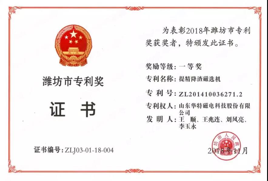 山東華特磁電科技股份有限公司發(fā)明專利“提精降渣磁選機”榮獲2018年度濰坊市專利獎一等獎,這是公司貫徹執(zhí)行國家知識產權戰(zhàn)略,將知識產權作為科技創(chuàng)新重要內容,強化成果轉化,提升經(jīng)濟效益的又一重大體現(xiàn)。